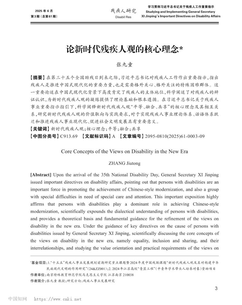 本文著录格式:张九童.论新时代残疾人观的核心理念[J].残疾人研究,2025,(03):3-11.