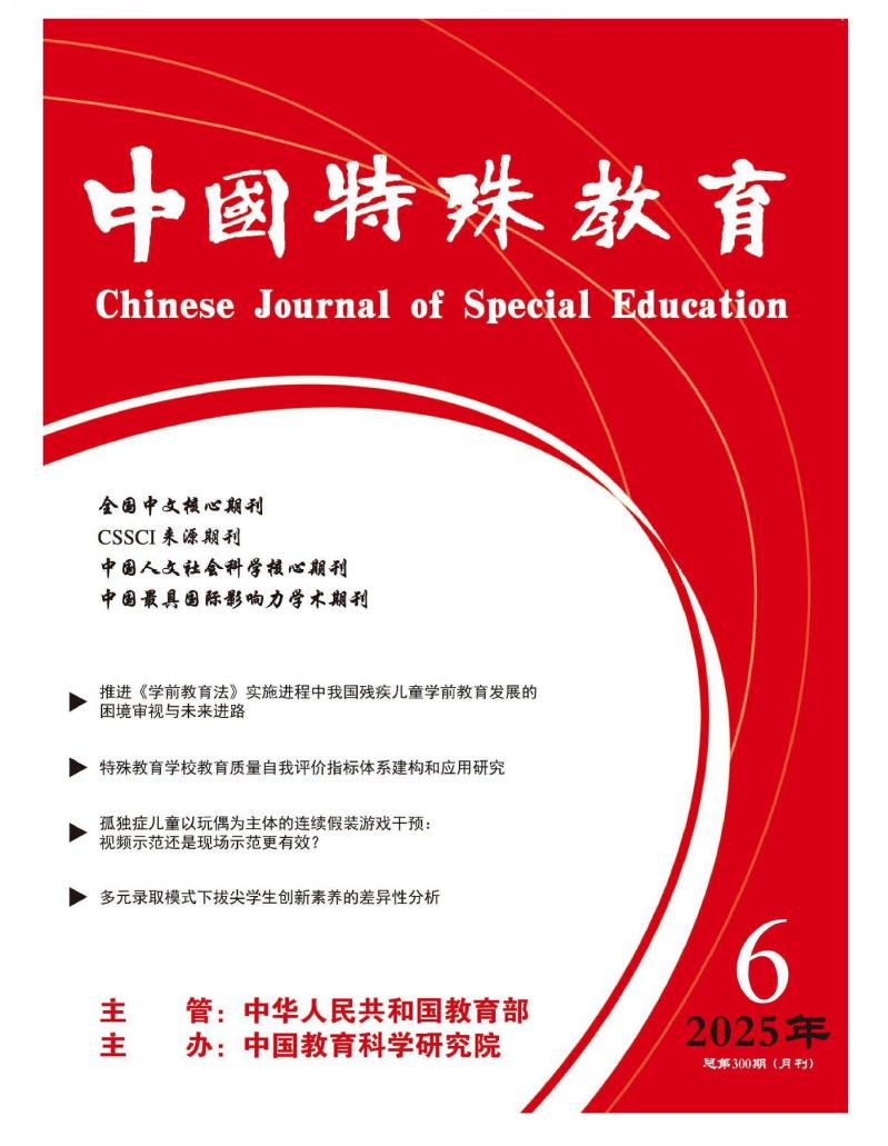 《中国特殊教育》杂志1994年创刊,现为月刊,是由中华人民共和国教育部主管、中国教育科学研究院主办、中国教育科学研究院心理与特殊教育研究所编辑出版的我国特殊教育领域核心学术期刊,是《中文社会科学引文索引》(CSSCI)来源期刊,全国中文核心期刊,中国学术期刊网(CNKI)来源期刊,中国人文社会科学核心期刊(AMI)。