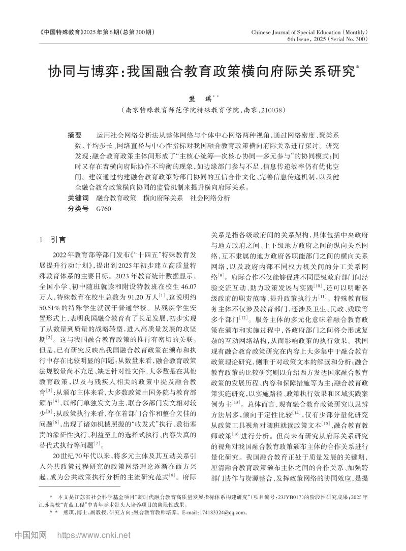 本文著录格式:熊琪.协同与博弈:我国融合教育政策横向府际关系研究[J].中国特殊教育,2025,(06):20-29.